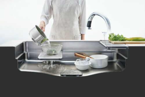 洗い物が多い時には、すすぎ前の食器を水切りプレートの上に仮置きするなどの工夫で、シンク内のスペースを有効活用できます。