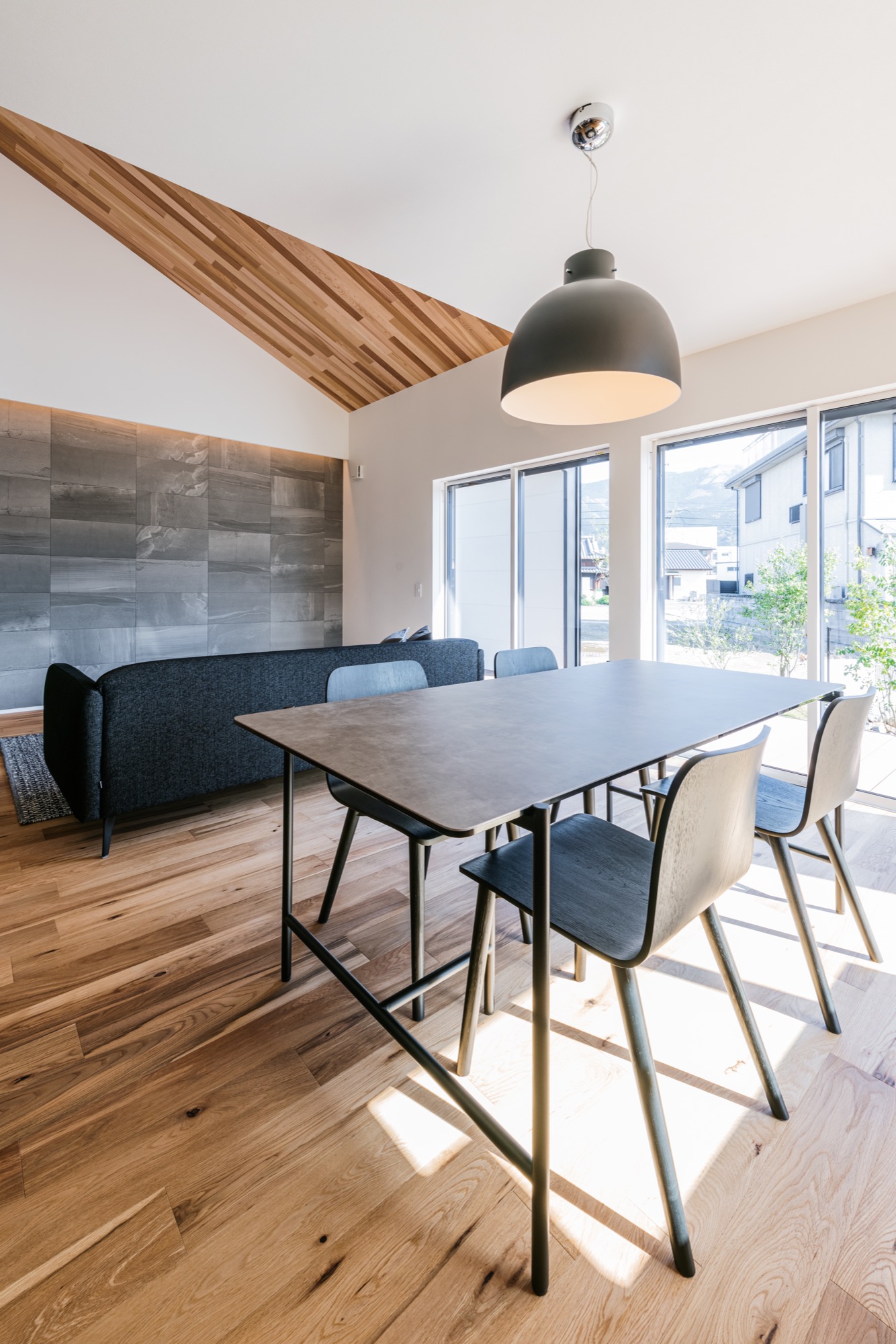 ダイニングの雰囲気にマッチする、ナチュラルなペンダントライトを採用。淡いグリーンのカラーがおしゃれです◎