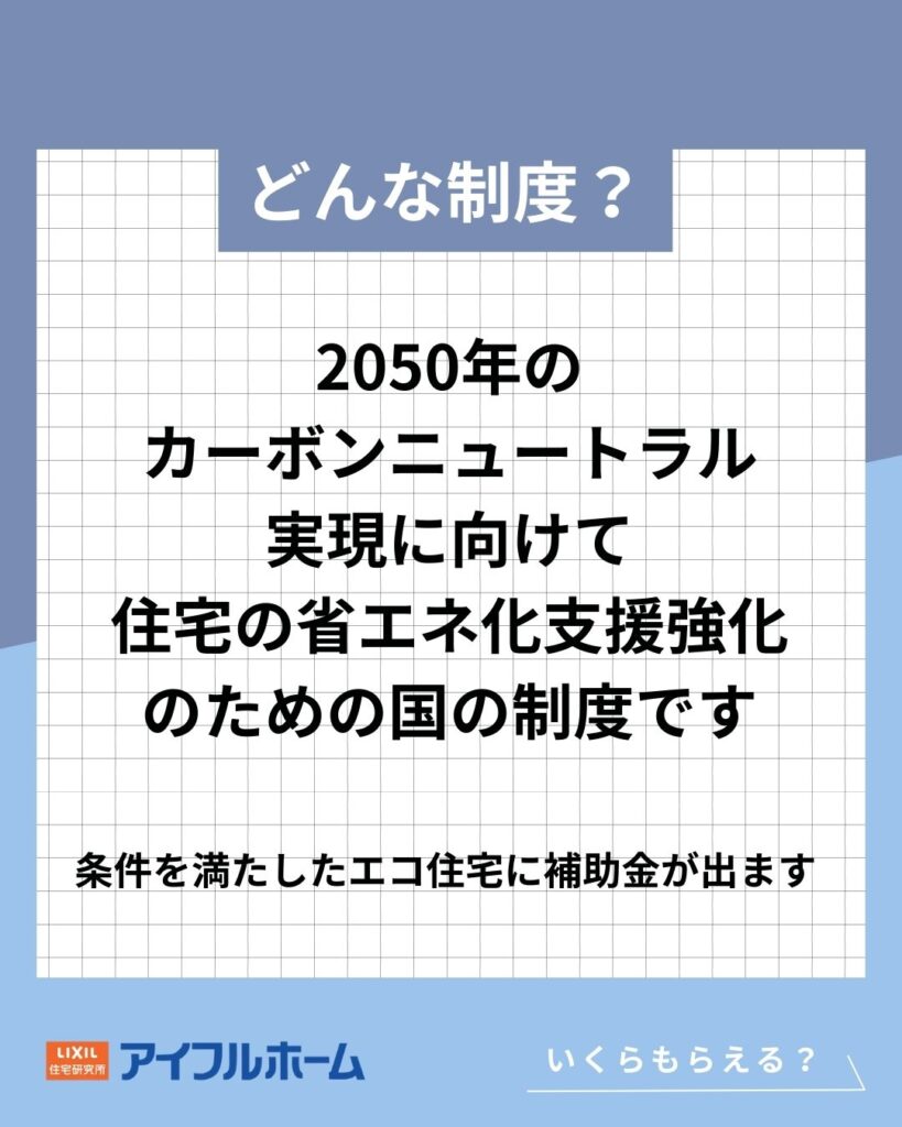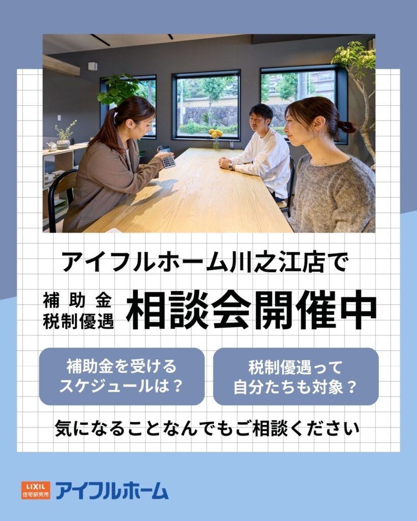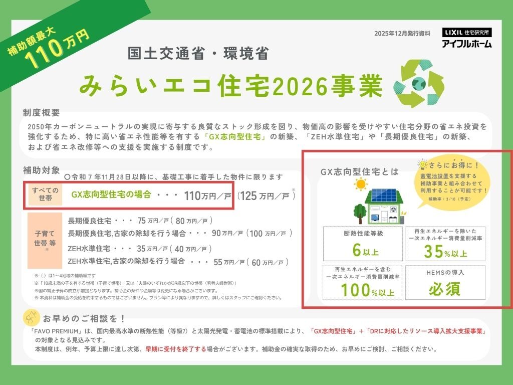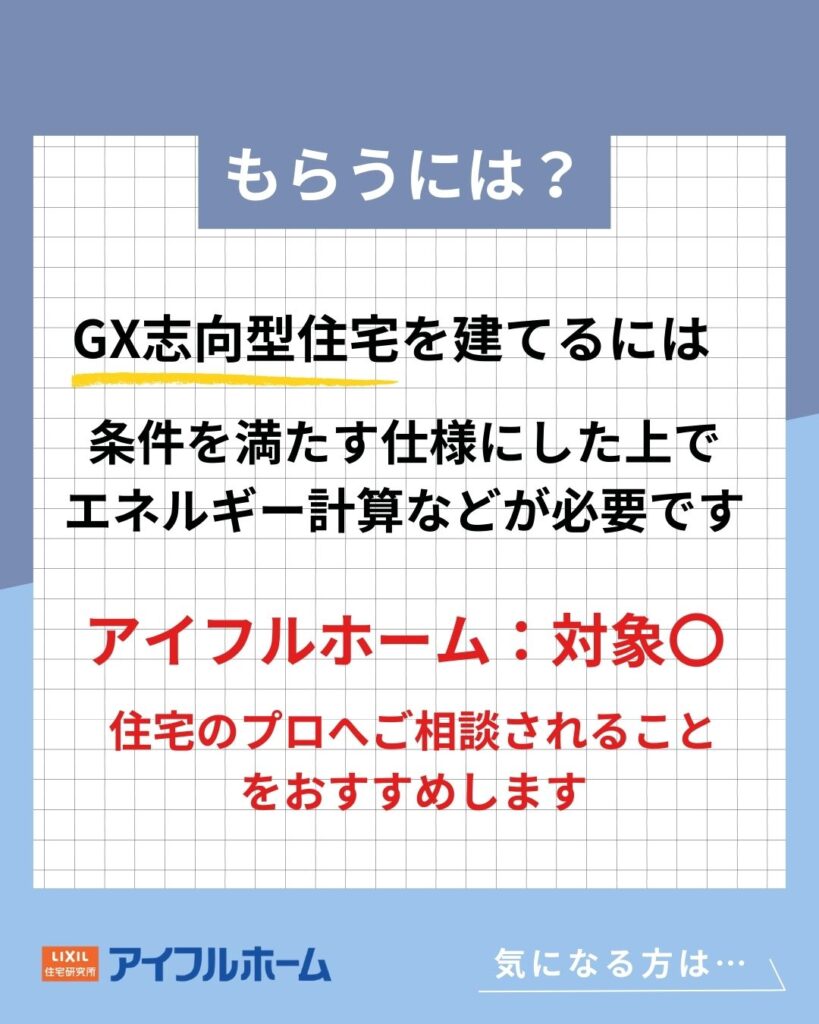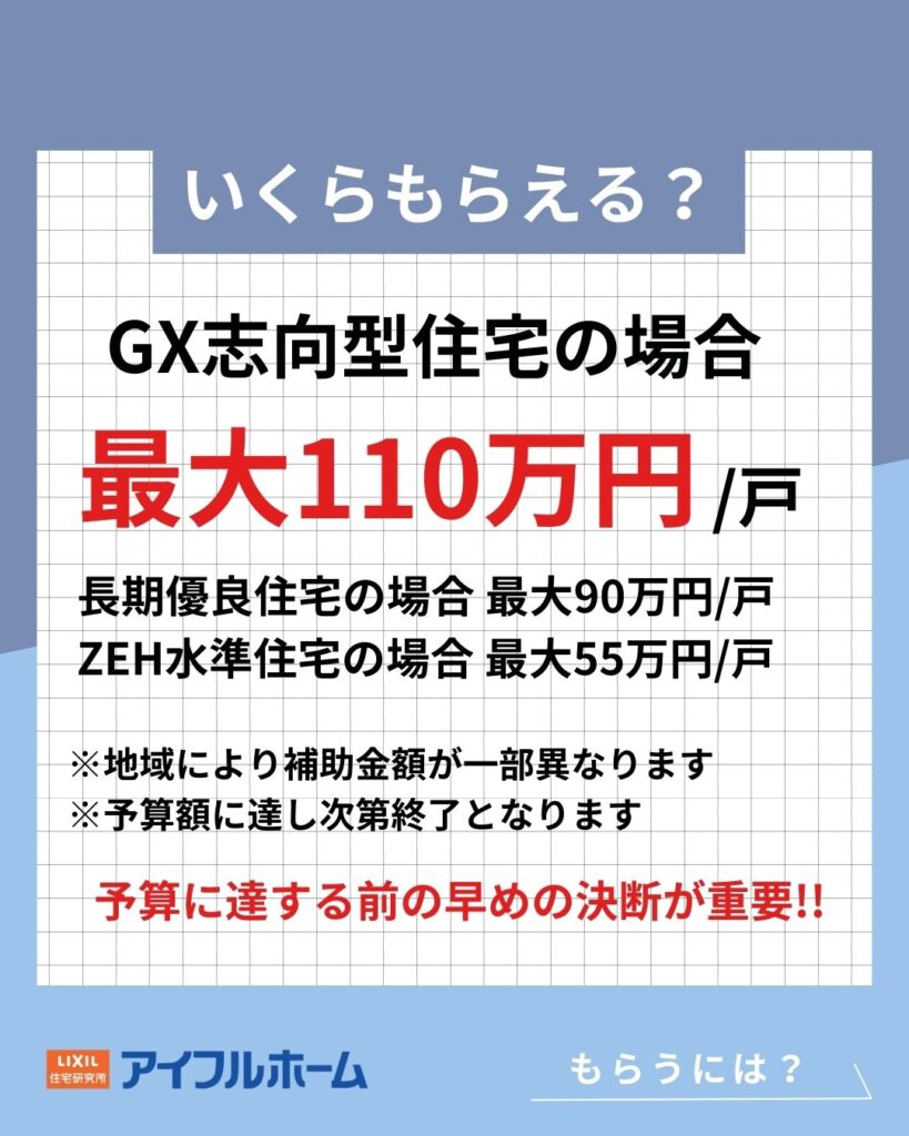 「GX(グリーントランスフォーメーション)志向型住宅」 ・110万円の補助額取得が可能 ・すべての世帯が対象 ※他の長期優良住宅とZEH水準住宅の場合は子育て世代のみ対象 住宅の条件 条件[1]断熱等級6以上 (UA値0.46以下) 条件[2]一次エネルギー消費量の削減率を、 太陽光発電ぬきで35%以上 (お家そのものの省エネ性能の高さ) 太陽光発電込みで100%以上 (そこに太陽光発電をプラスした省エネ性能) 条件[3]HEMS(ヘムス)機器の設置等 (お家のエネルギーの使用状況などが管理できる機器のこと) カーボンニュートラルに向けて、 日本の住宅の省エネ性能を強化するための施策と補助金です。 2025年のGX志向型住宅補助金は、 7月22日で予算上限に達し、 終了してしまいました。 この事業の補助金は、 家を契約したら申請できるのではなく、 申請可能になるには、 いくつか条件があり、 特に重要なのが、 お家の基礎工事が出来上がるところまで進んでないといけません。 そのため、補助金の申請が開始された4月頃から動き出した方は、 間に合わなかった方が多いように思われます。 会社選び・土地探し・資金計画 そして契約・打合せ・etc 諸々決まってようやく、 建築確認申請を提出し、 確認申請が許可になってからようやく、 お家は着工できます。 今すでに動き始めておられた方はチャンスですし、 年内から動き始めれば、 まだ間に合う方もいらっしゃると思います。 アイフルホーム川之江店では、 モデルハウスの見学に加え、 土地探し、 資金計画の各種相談会も平日・土日に開催しております。 (水曜定休) 四国中央市で 補助金を使った家づくりをご希望の方は、 まずはお気軽にお問い合わせください!